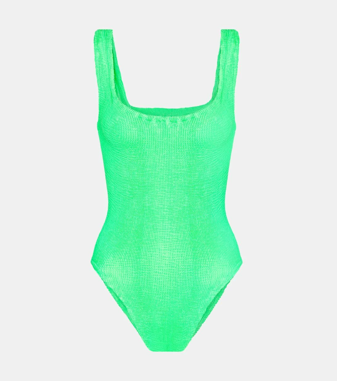 Berühmt wurde das Label Hunza G bereits in den 90er-Jahren. Die Marke steht für retroeske Swimwear aus Seersucker in strukturierter Knitteroptik. Dabei kommt jedes Design in einer Einheitsgröße und passt sich ideal an unsere Silhouette an. Tragen Sie diesen grünen Badeanzug mit breiten Trägern und hohem Beinausschnitt zu einer Cat-Eye-Sonnenbrille.