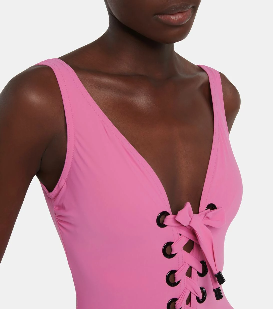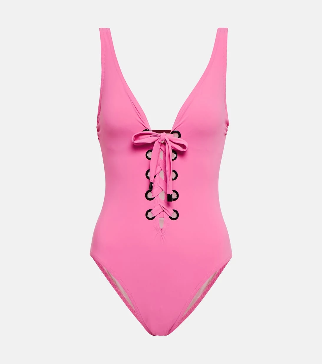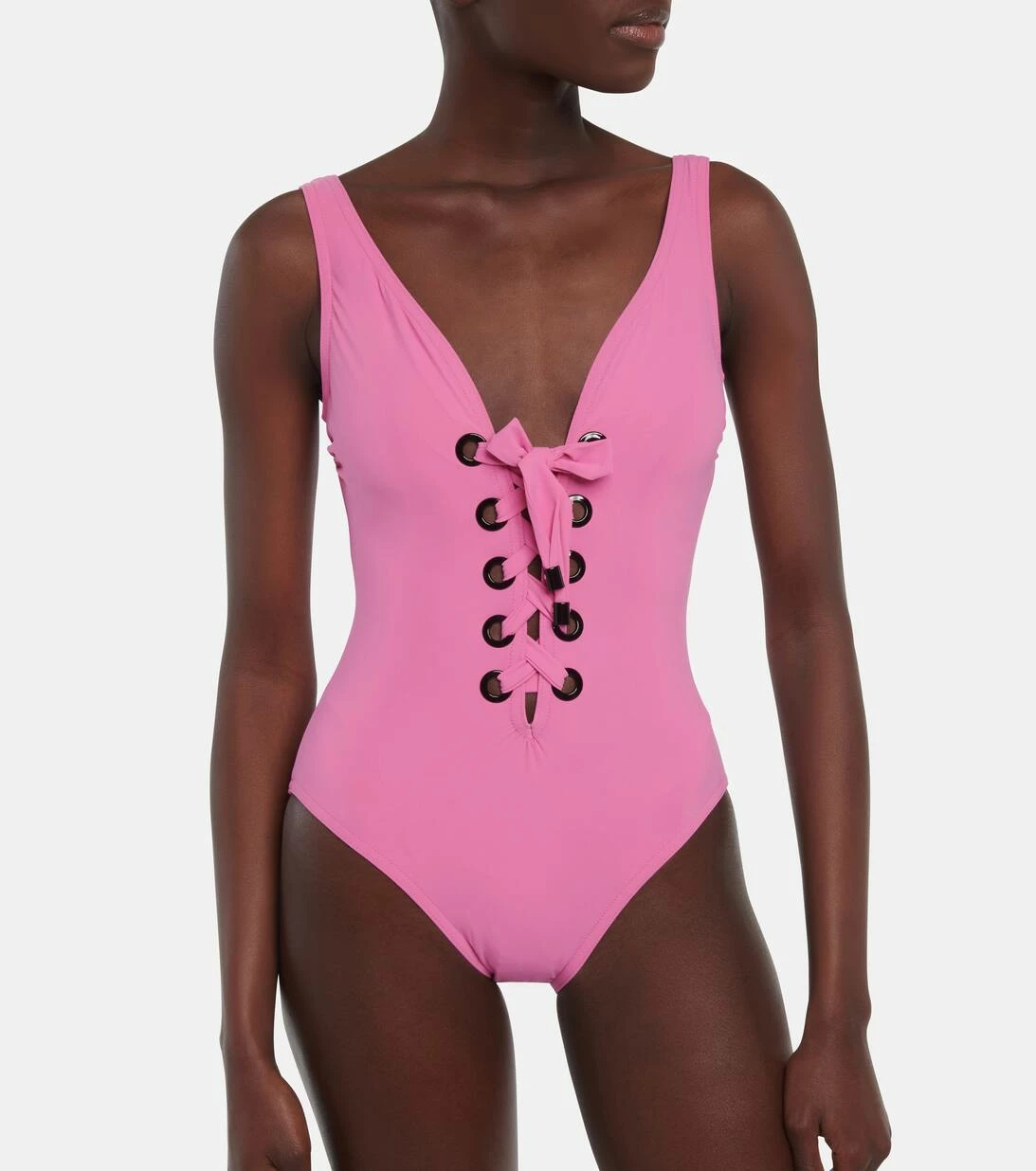 Beeindrucken Sie am Pool mit dem Lucy Badeanzug. Er ist mit einem stützenden Bügel versehen und verfügt über einen tief ausgeschnittenen Rücken und ein modernes Schnürdetail vorne mit polierter schwarzer Hardware. Bei der Swimwear von Karla Colletto treffen feinste Stoffe auf innovative Fertigungstechniken und Tailoring-Expertise.