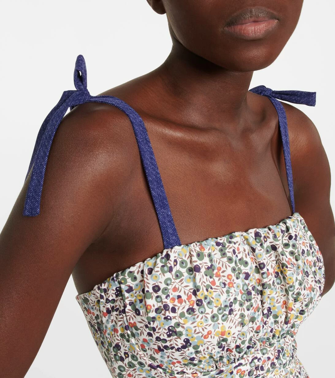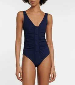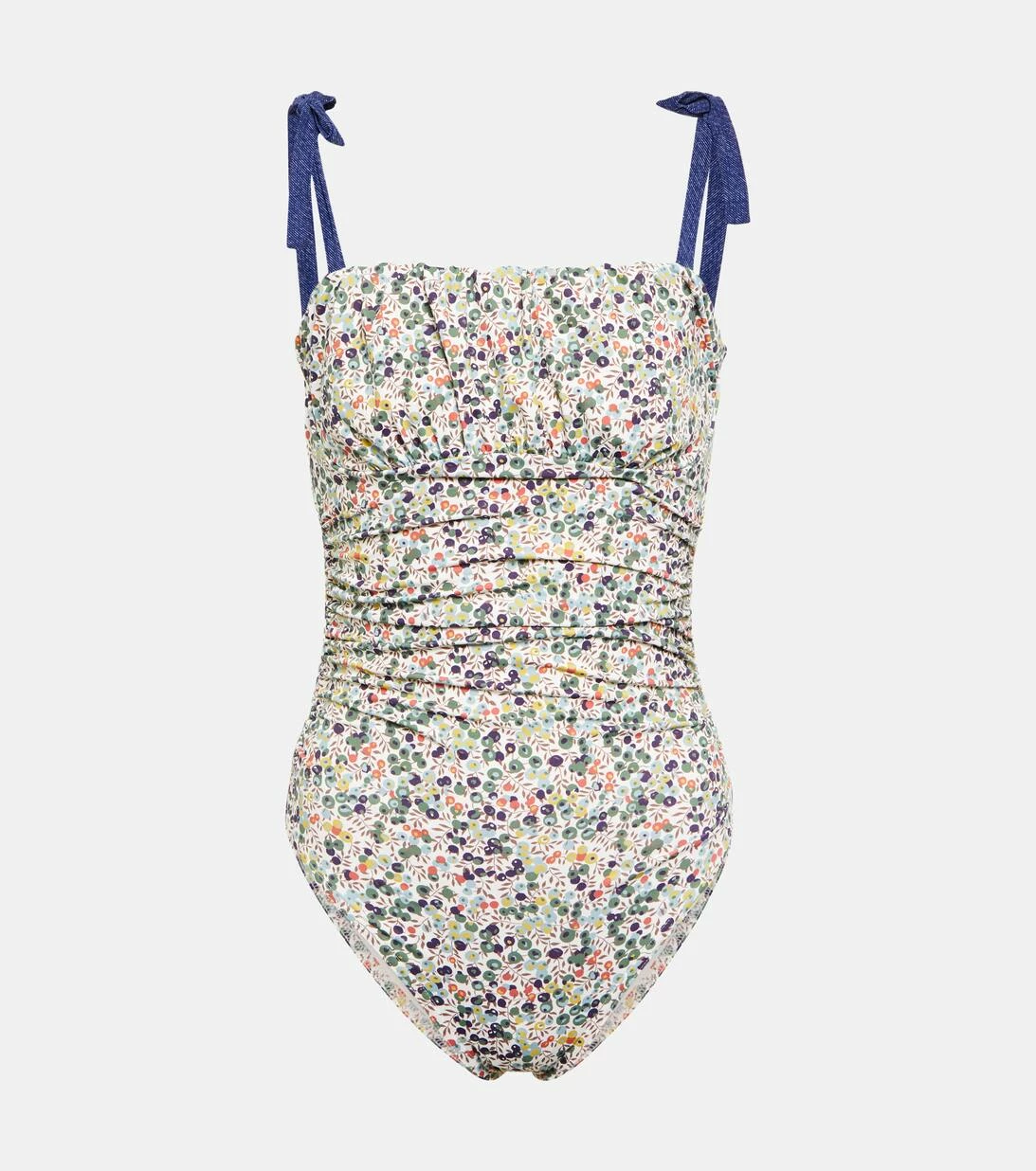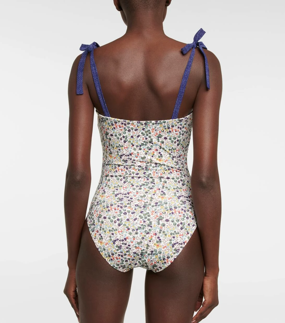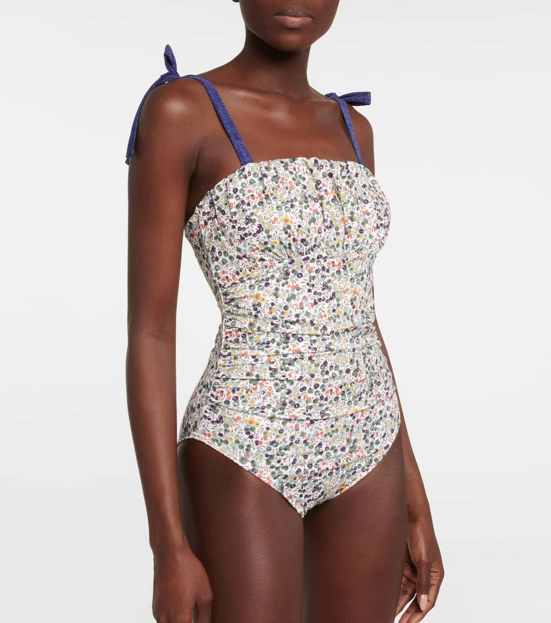 Der Claire Badeanzug von Karla Colletto mit Print bietet eine moderate Bedeckung. Er verfügt über geraffte Details an der Brust, einen integrierten BH und Bänder zum Binden.