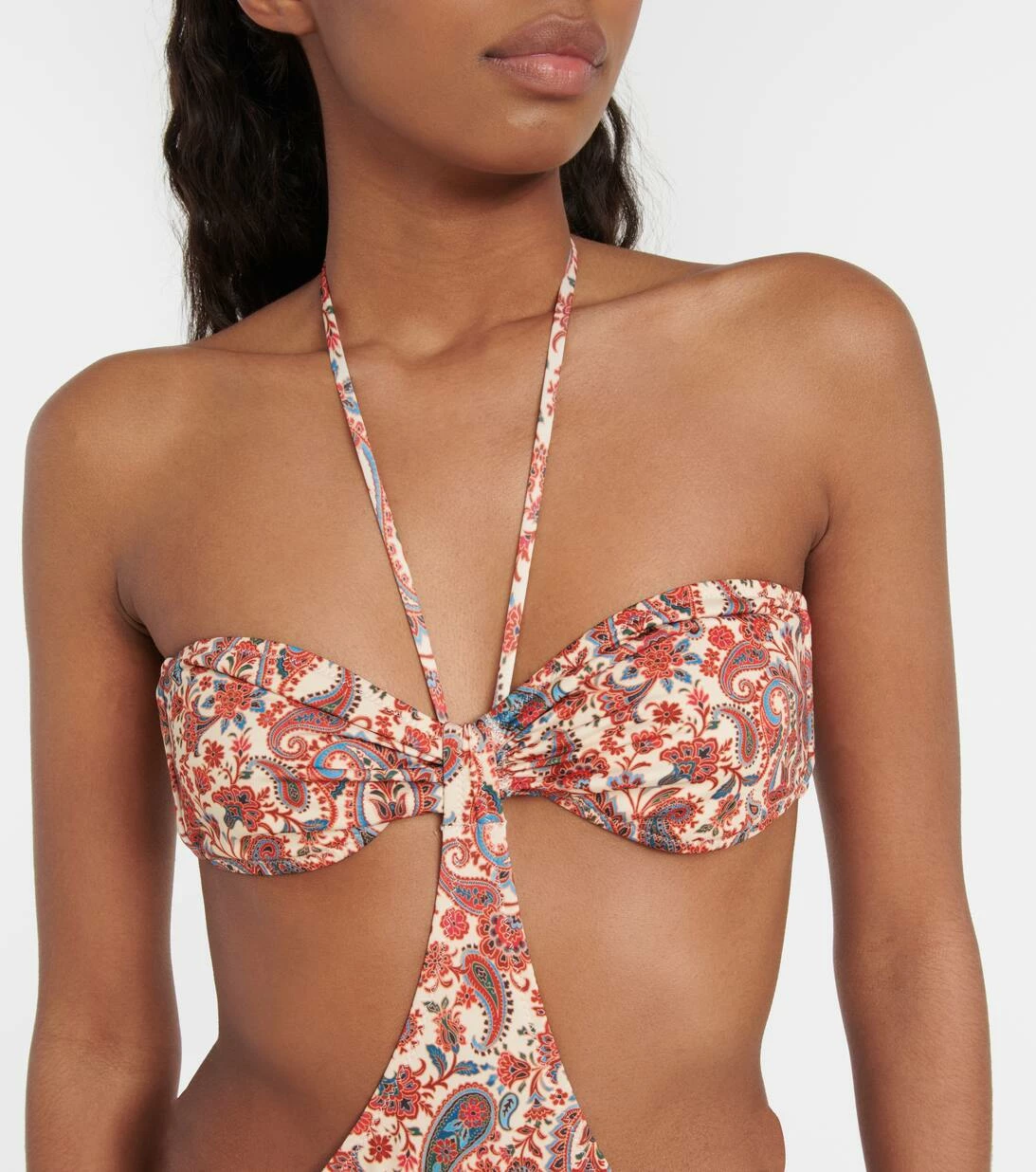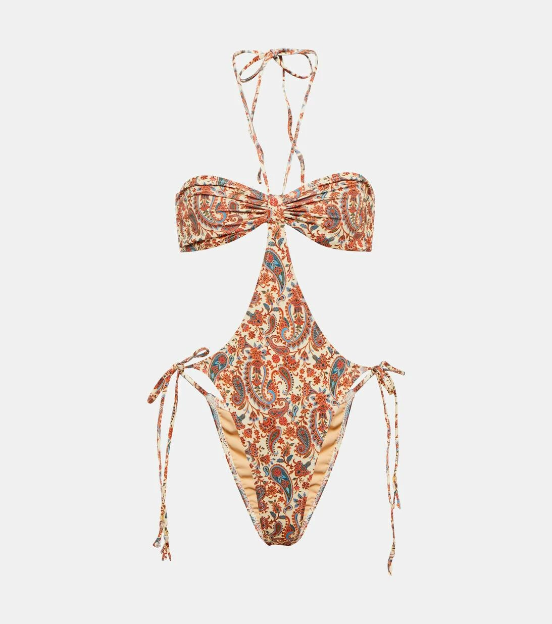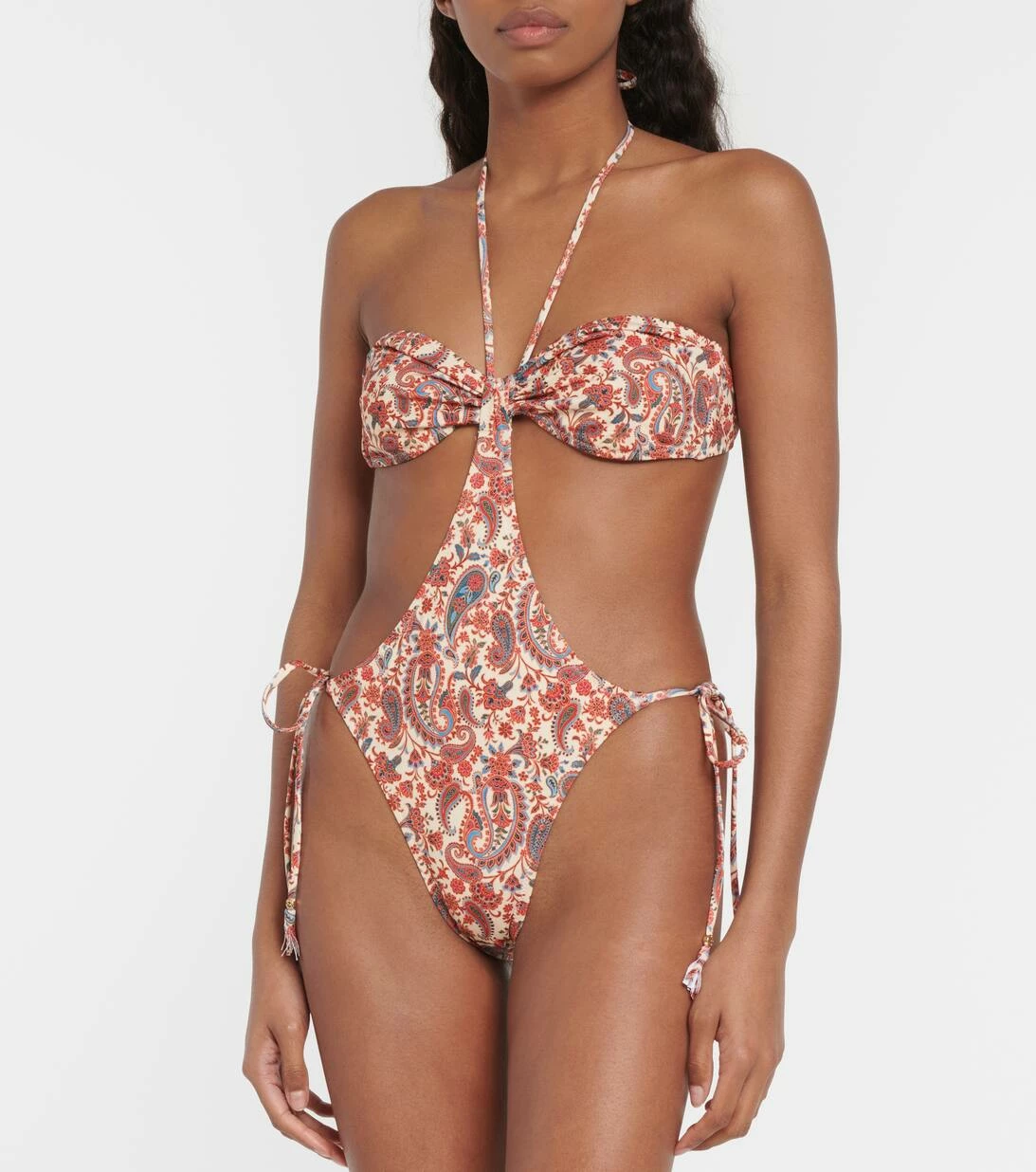 Der Jade Badeanzug von Bananhot besticht durch charmante Cut-outs und einen detailreichen Paisley-Print. Er verfügt zudem über einen Neckholder-Träger und seitliche Schnürungen, wodurch der Fit individuell angepasst werden kann.