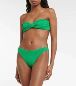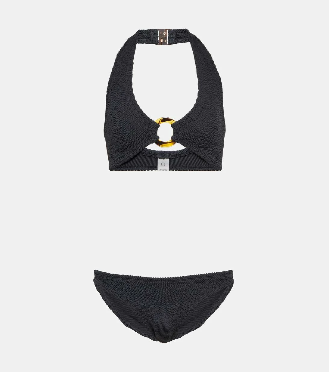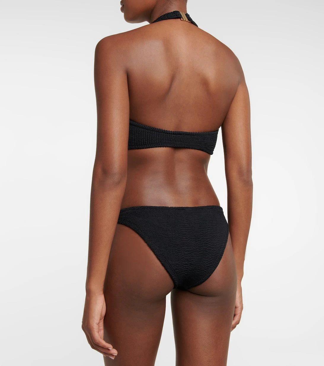 Der Coco Bikini besteht aus einem Oberteil mit Neckholder-Ausschnitt und einem klassischen Höschen. Der charakteristische Stoff von Hunza G basiert auf der Seamless-Crinkle-Technologie, die der Bademode eine Einheitsgröße verleiht.