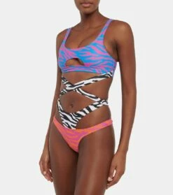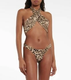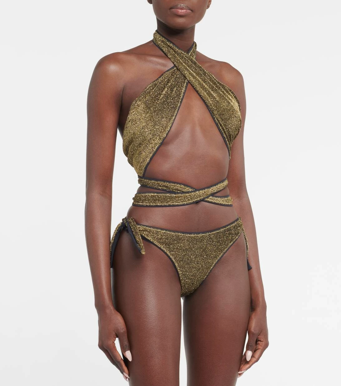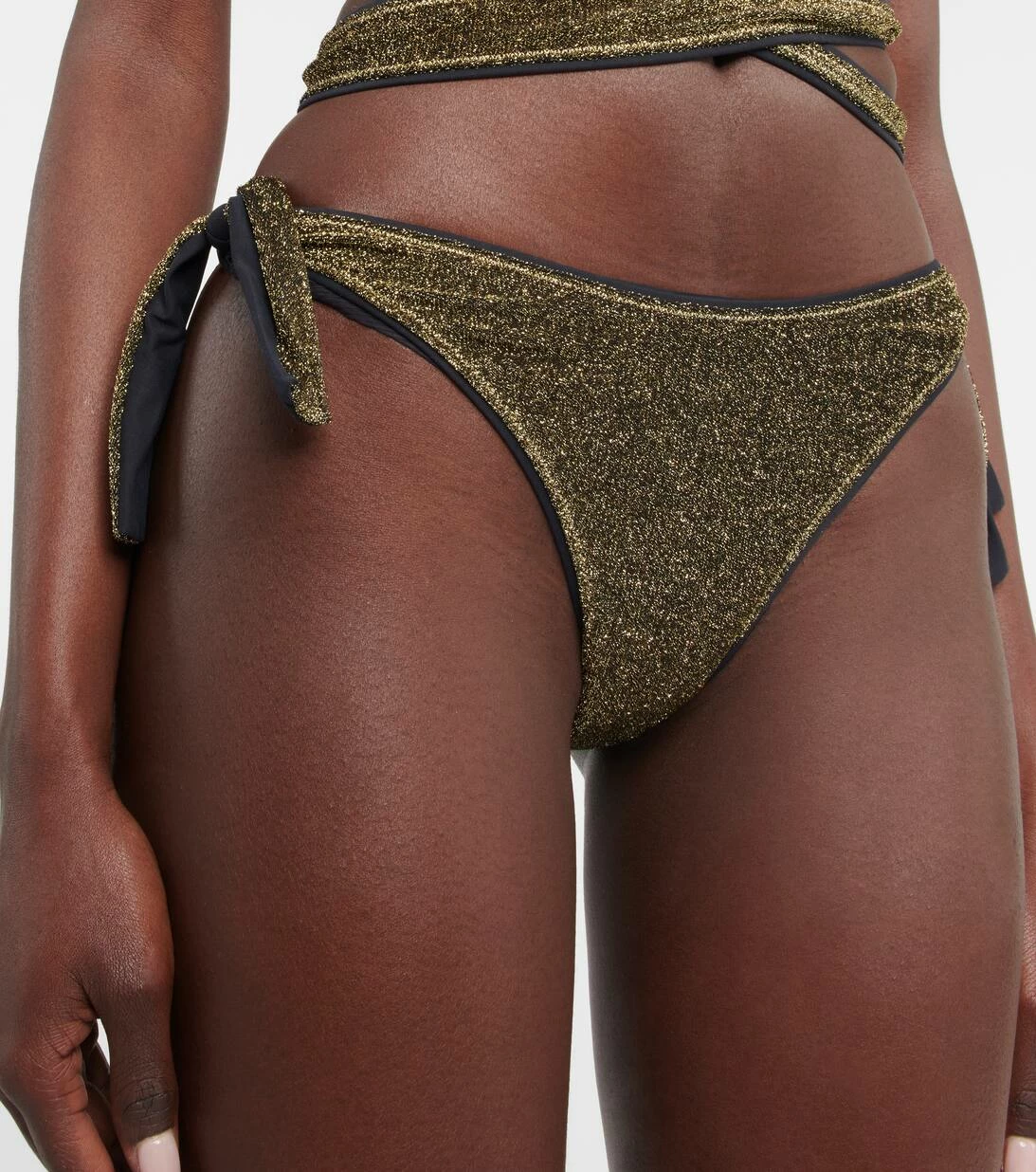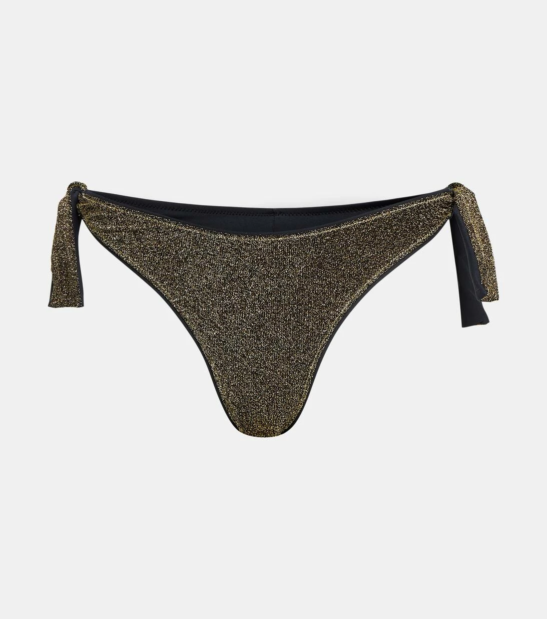 Das Bikini-Höschen von Reina Olga präsentiert sich in auffälligem goldfarbenem Lurex®. Das in Italien handgefertigte Modell mit schmeichelhaft hohem Beinausschnitt und seitlichen Bändern zeigt die charakteristischen Nähte.