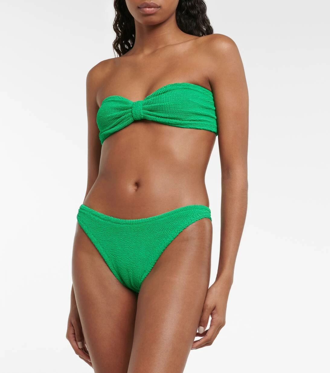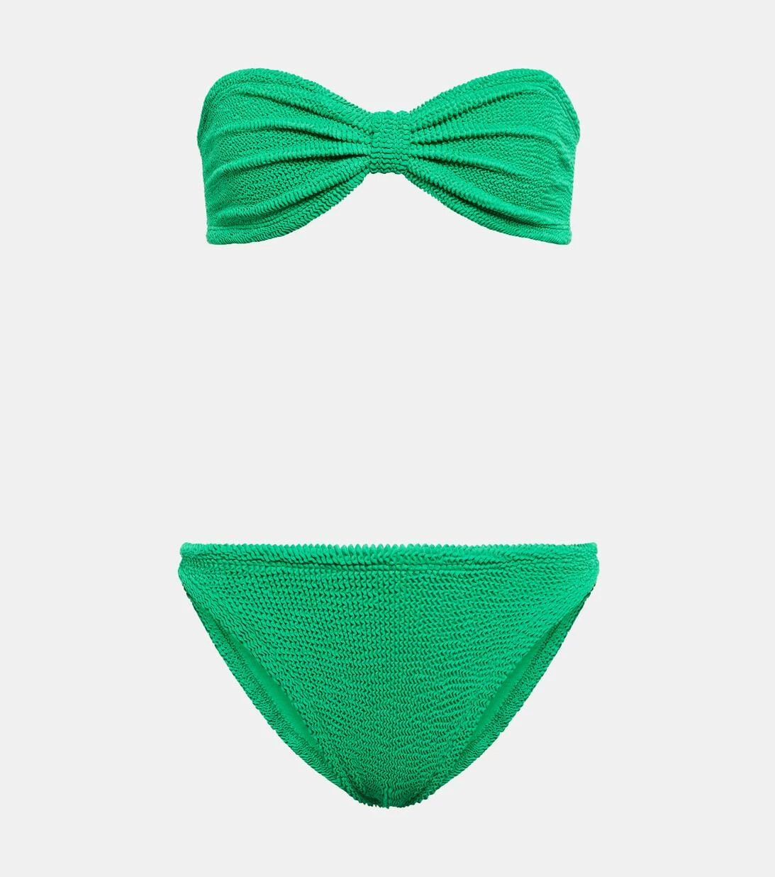 Der grüne Jean Bikini von Hunza G besteht aus einem Bandeau-Oberteil und einem Höschen, das minimale Bedeckung bietet. Das Modell wurde mit der Seamless Crinkle-Technologie des Labels gefertigt, die perfekten Komfort verspricht.