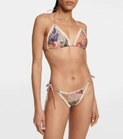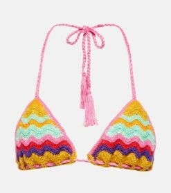 Dieses Bikini-Oberteil von Anna Kosturova wurde aus bunter Baumwolle gehäkelt. Es zeigt sich in einer klassischen Triangel-Silhouette mit Chevron-Muster und geflochtenen Bändern, die mit weichen Troddeln verziert sind.