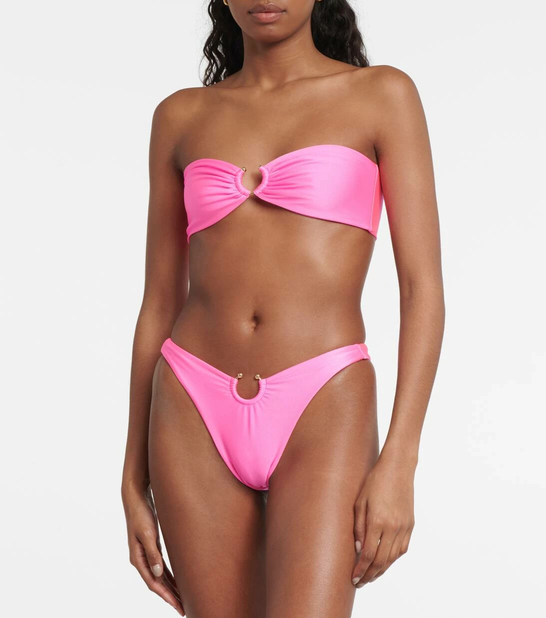 Same Los Angeles zeigt das klassische Bikini-Oberteil mit Bandeau-Ausschnitt in einem neuen edlen Look. Das Design verfügt über goldfarbene Hardware, ein Band zum Binden am Rücken und seitliche Stäbchen, die für einen guten Sitz und mehr Halt sorgen.