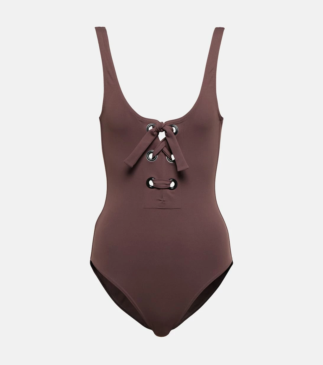 Der Cléodore Badeanzug von Eres zeichnet sich durch einen tiefen Ausschnitt mit einer Schnürung und markanten Ösen aus. Das in Frankreich gefertigte Design mit breiten Trägern und einem ebenfalls tiefen Rückenausschnitt bietet minimale Bedeckung.