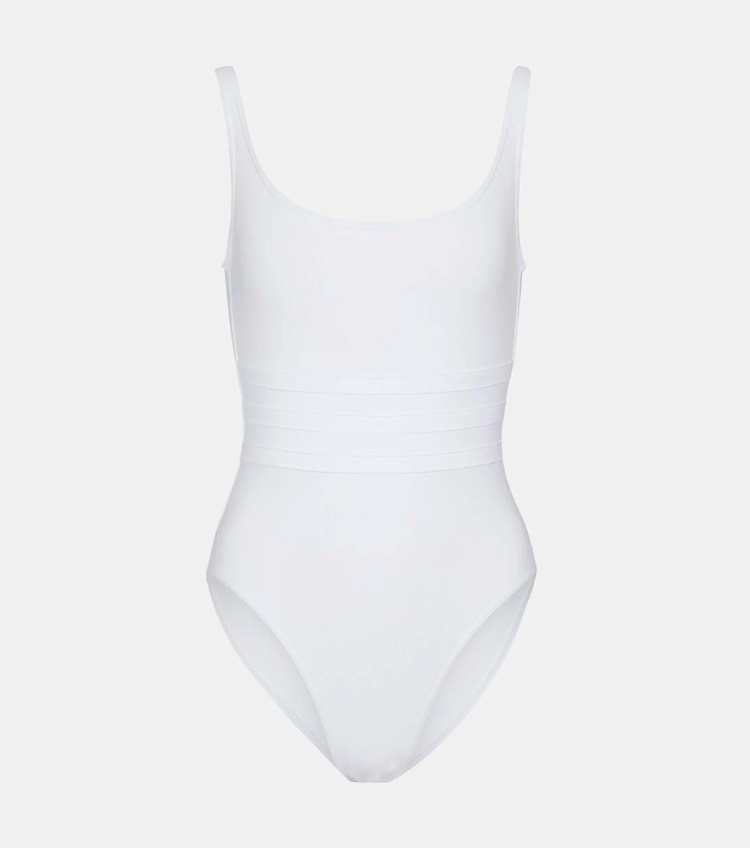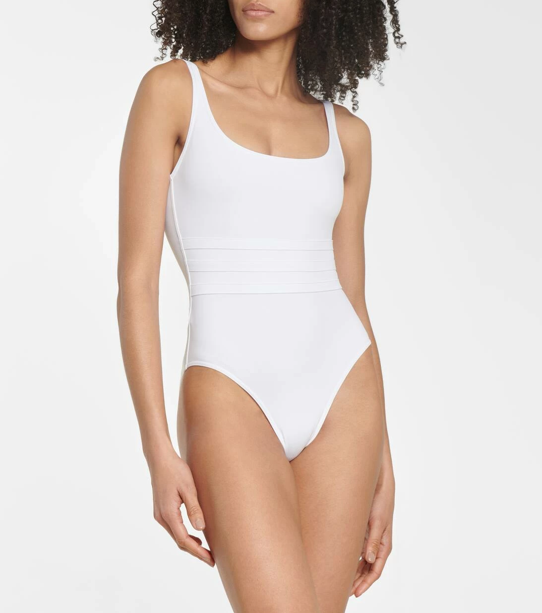 Der Sonne entgegen: Der weiße Les Essentiels Asia Badeanzug aus dem innovativen Peau Douce-Gewebe von ERES strafft Ihre Figur und bietet dank schmaler Träger und eines Unterbrustbands perfekten Halt. Die Raffung in der Taille sorgt dabei für ein schlichtes Highlight. Wählen Sie einen bunten Turban sowie eine große Sonnenbrille dazu.