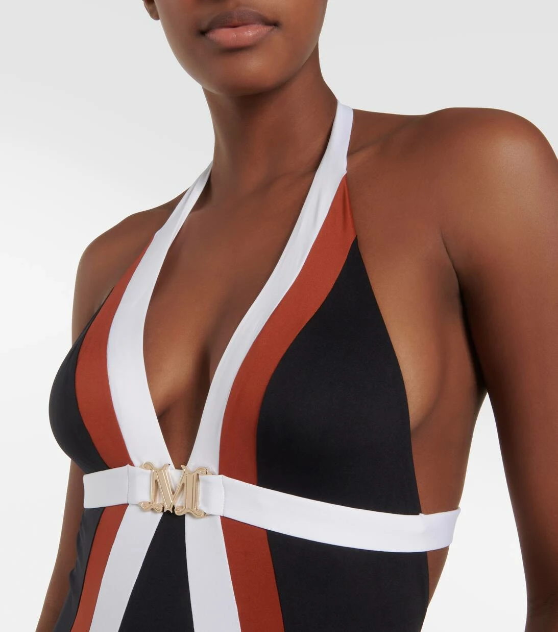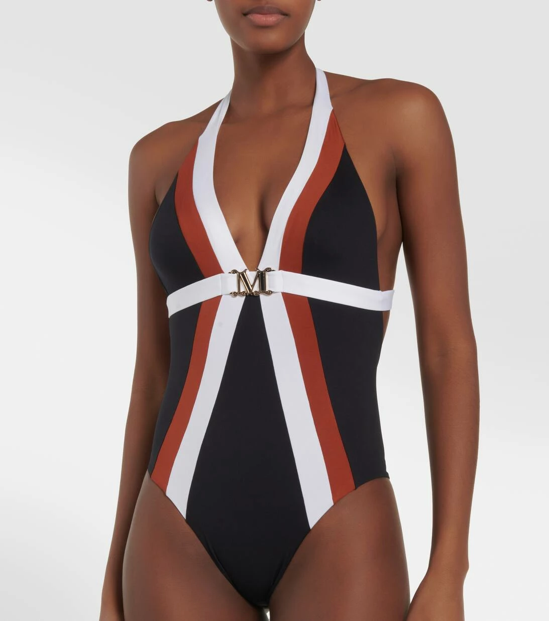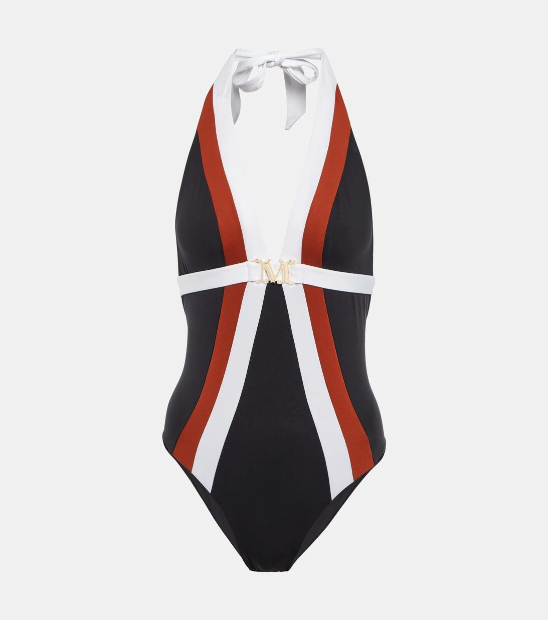 Der gestreifte Cristel Badeanzug von Max Mara wurde aus elastischem Jersey gefertigt. Er zeigt sich als Neckholder Design mit offenem Rücken und einer Logoplakette aus Metall. Bitte beachten Sie, dass dieser Artikel eine mittlere Bedeckung bietet.