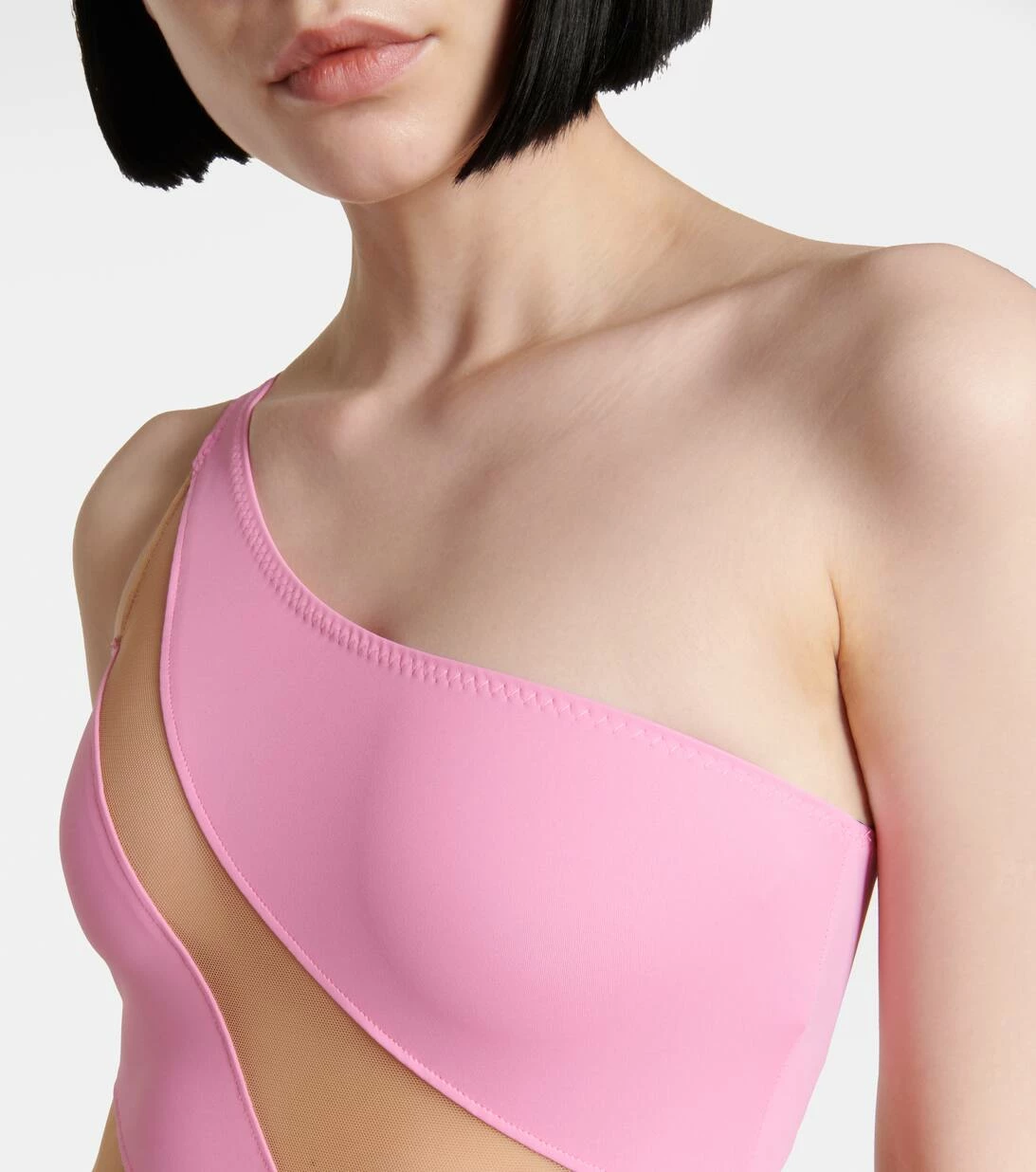 Der Snake Mesh Mio Badeanzug von Norma Kamali ist ein Paradebeispiel für gewagtes Design. Das rosafarbene One-Shoulder-Modell hat eine hoch geschnittene Passform, die mit transparenten Meshdetails versehen ist.