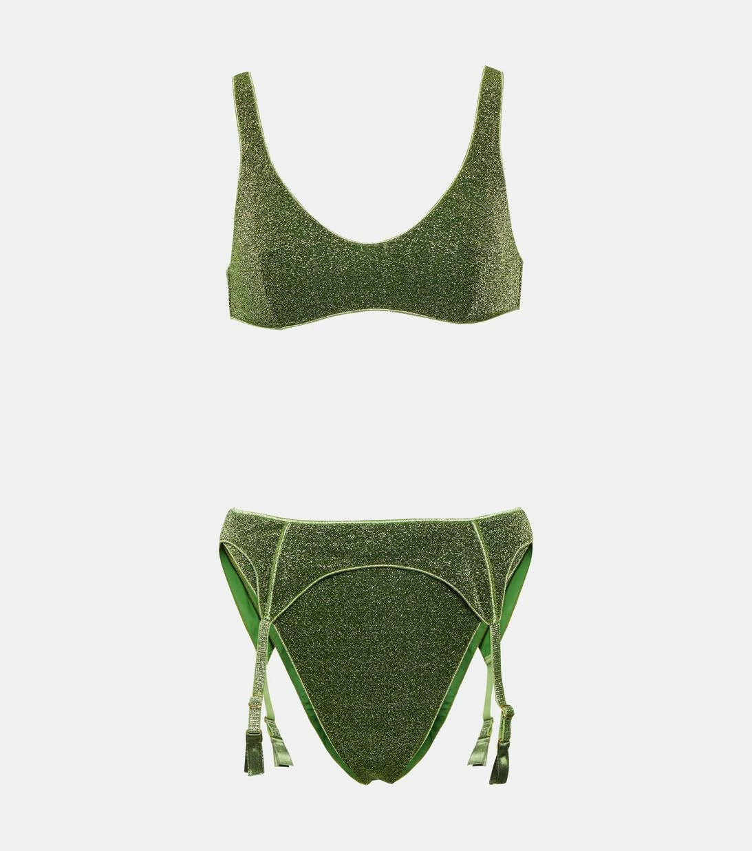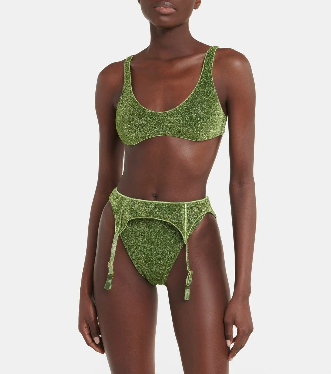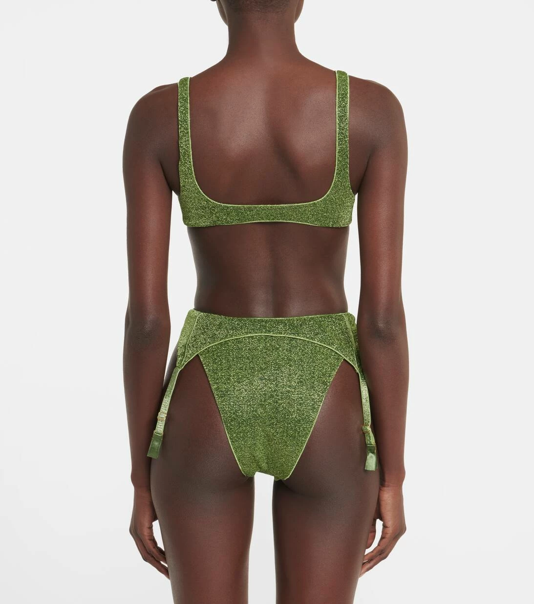 Der Lumière Stoff von Oséree ist mit sehr feinen Metallic-Fäden versehen, die ein einzigartiges schimmerndes Finish erzielen. Der Sporty Belt Bikini besteht aus einem Oberteil und einem High-Rise-Höschen mit befestigtem Strumpfhalter.