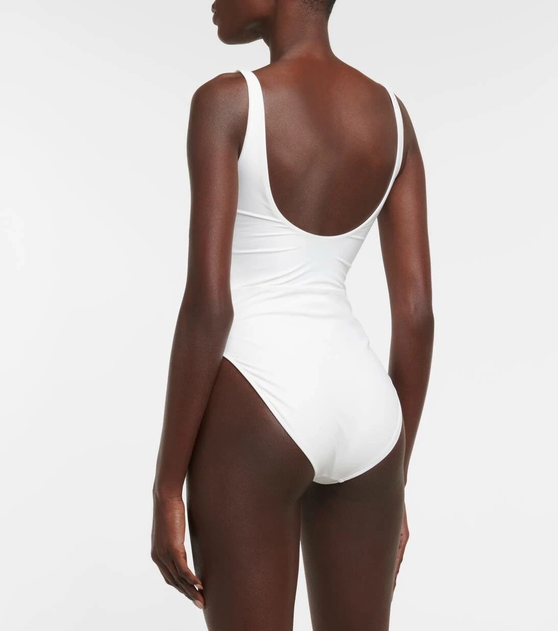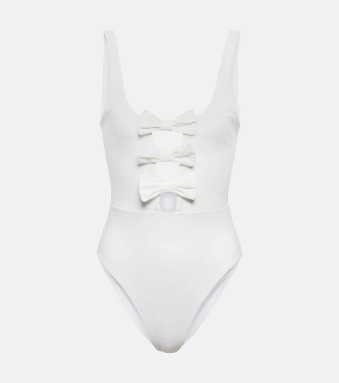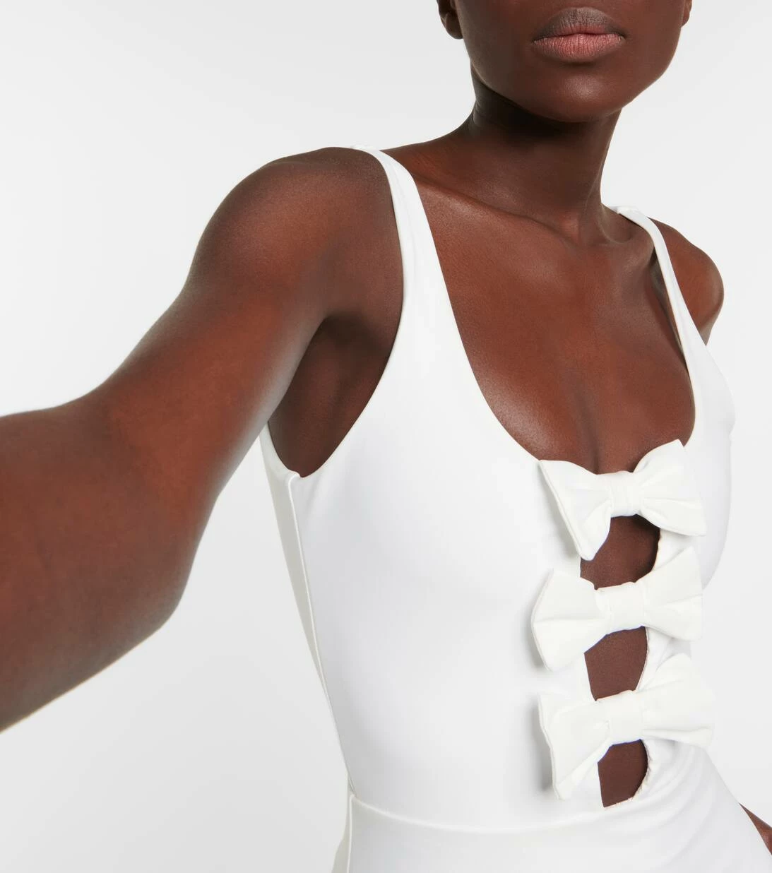 Der Elena Bow Badeanzug von Rebecca Vallance kombiniert die charakteristischen Schleifen der Marke mit gewagten Cut-outs und einem tiefen U-Ausschnitt hinten zu einem unvergesslichen Look. Dieses Modell ist ungepolstert, aber komplett gefüttert und hat eine moderate Bedeckung.