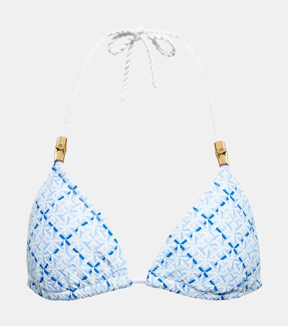 Das Grand Cayman Bikini-Oberteil von Heidi Klein besteht aus einem blau-weiß karierten Stoff mit Wabenstruktur und präsentiert sich als Triangel-Silhouette mit geflochtenen Trägern und goldfarbenen Akzenten.