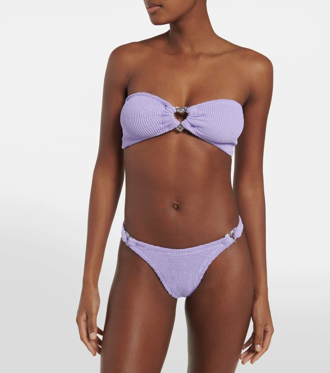 Diese Version des Nicole Bikinis von Hunza G präsentiert sich in einem strukturierten lilafarbenen Design. Es ist sowohl auf dem Bandeau-Top als auch seitlich am Höschen mit silberfarbenen Herzen verziert.